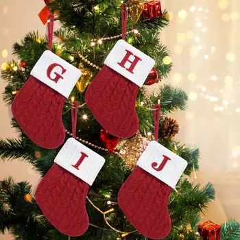 Christmas Cable Knit Ornament Red Embroidery Letter Hanging Stocking Santa Candy Gift Bag Decorative Knitted Sock Ornament